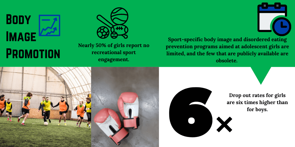 Sport has a range of benefits including physical health, leadership, socialization, and mental health. However, the latest research continues to show that most girls are not realizing these benefits. Nearly 60% of girls aren’t meeting recommended exercise guidelines. Reports of sport quality suggest that a significant factor that prevents girls from continuing in sport is due to negative body image and the body pressures faced when in the sport environment.